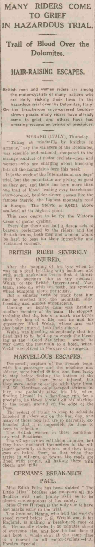 The International Silver Vase was won by Holland (Rudge team). Britain’s big honors came with the 500 c.c. contest for the F.I.C.M. Gold Medal (Manufacturers Teams Prize), the Rudge team — Williams. McGrecor. and Miss Lermitte — losing no marks. Rudges also won six gold medals. At the completion of the Trial. J. Williams (Rudge) completed the Monza speed section at over 80 m.p.h. yet was a gold medalist for reliability. He lost no marks. was a member of the winning manufacturer’s tream, completed the 1.200 miles cf road including Italian alpine passes, totalling 30,000 feet of climbing; numerous twists and turns, rain, snow and sleet, without a flaw, and again proved the magnificent all-round reliability of his Rudge. TEAMS’ PRIZE TO TRIUMPH The Italian team on “NT’ Triumphs tied with the Rudges in the Manufacturers’ Teams’ Prize event. Only three entries, and gained three gold medals. At the concluding test on Monza Sneedway.’ says ‘Motor Cycle.’ ‘the chief glory rested with the Italian team. Opessi, Berardi, and Marin. riding British Triumphs. Not one had dropped a single mark all the week. They circled Monza in line abreast, two yards apart, as if attempting the perfect dirt track start.’ So the world’s greatest trial concludes with Rudge and Triumph again up holding British honors.”