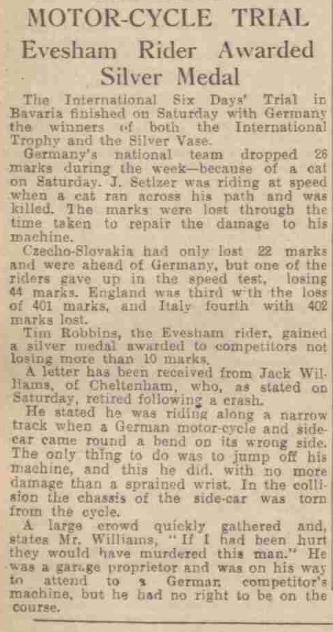 Image of scanned news article in ‘the Cheltenham Chronicle‘ 21 Sept 1935 on ISDT 1935 and local riders Tim Robbins of Evesham and Jack Williams of Cheltenham.