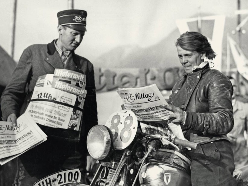 Thanks to our regular helper A Holthaus who brought this picture of Mrs Ilse Thouret to our attention “Motorradfahrerin Ilse Thouret liest die B.Z. am Mittag am Etappen-Ziel der Sechstagefahrt in Garmisch-Partenkirchen ISDT 1936”