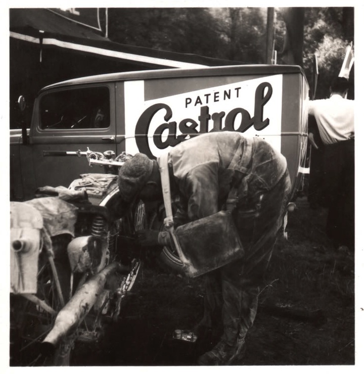 Photo of rider with British plated bike at Castrol Service stand ISDT 1939 (courtesy of the Stephen Dolling Collection)