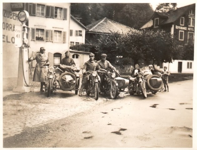 Photo of solo and sidecar motorcycles at Petrol pump ISDT 1939 (courtesy of the Stephen Dolling Collection)