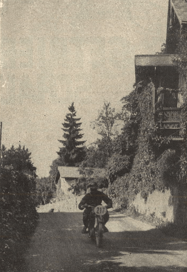 Photo – Good roads again at last, and not far from the end of the tiring first day’s run. L Heath (497 Ariel) leaves the rough stuff behind at Vöklm. ISDT 1939 (Speedtracktales Archive)