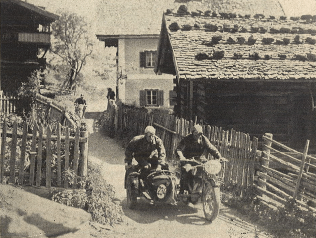 Photo – Typical of many villages through which the trial passed was Hof, seen above. The machines are lightweights – a Puch and a DKW – ridden by #250 P Günther and #233 G Sandküler. ISDT 1939 (Speedtracktales Archive)