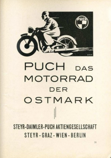 Image of scanned advert from official programme ISDT 1939 for Puch. Puch Motorcycles were made by the German Austrian Company Steyr Daimler Puch.