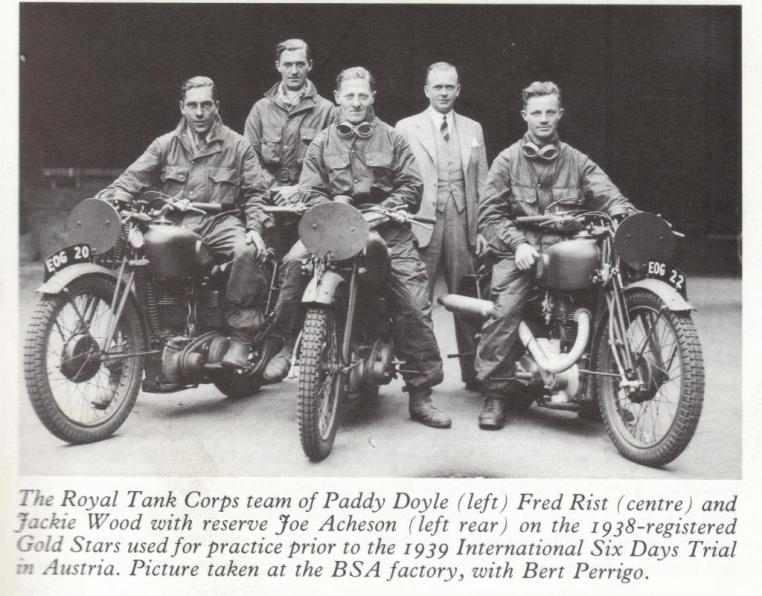 ISDT 1939 – Germany 28 Monday Jan 2013 Original size at 1024 × 801 ≈ Leave a comment Photo of BSA mounted Royal Tank Corps team of Paddy Doyle [EOG 20], Fred Rist and Jackie Wood [EOG 22] with Joe Acheson and former ISDT legend and now BSA Factory staffer Bert Perrigo Like Loading...