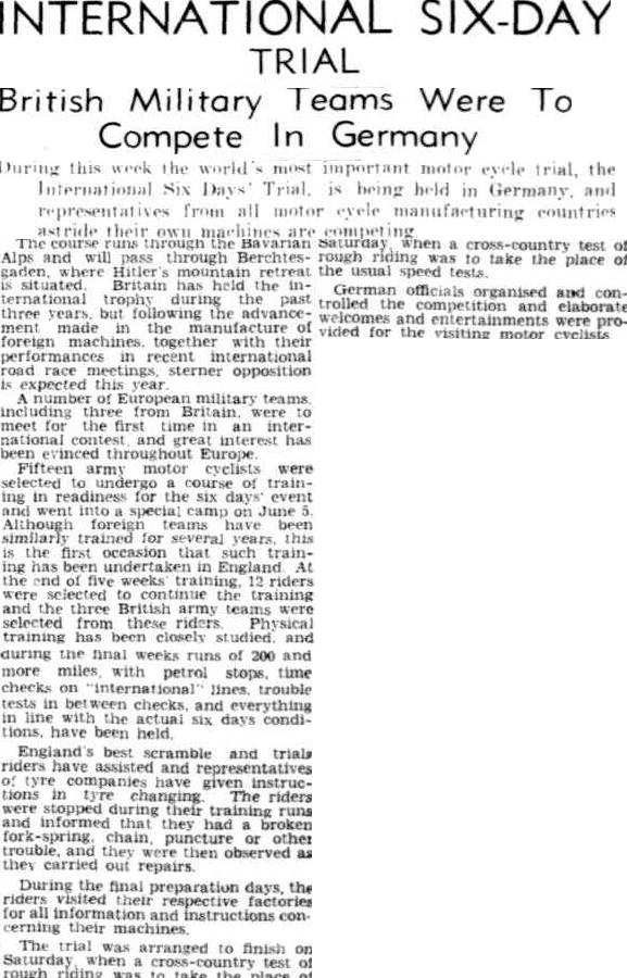 ISDT 1939 – Germany 17 Sunday Nov 2013 Original size at 577 × 900 ≈ Leave a comment image – scanned article in ‘the Advertiser’ Adelaide South Australia 24th Aug 1939 covering the involvement of British Army teams in the ISDT 1939 Like Loading...
