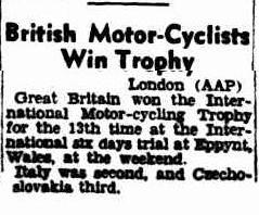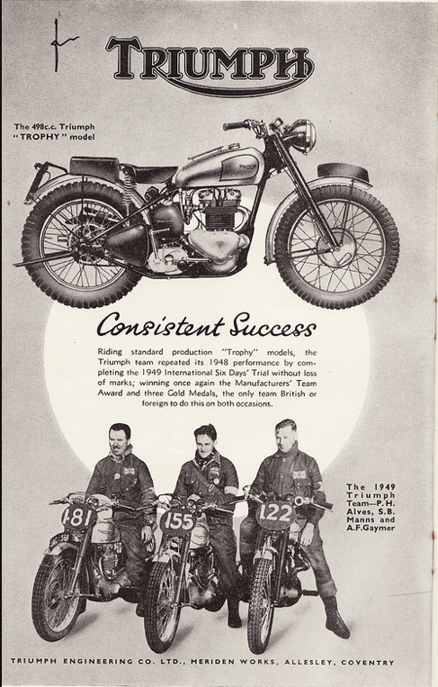 Triumph fielded again three of the great british riders of the time PH Alves, S B Mann and A F Gaymer who picked up a manufacturers award for Triumph who celebrated with this advert with the 3 riders and their machines. Alves also rode in the winning Great Britain Trophy team