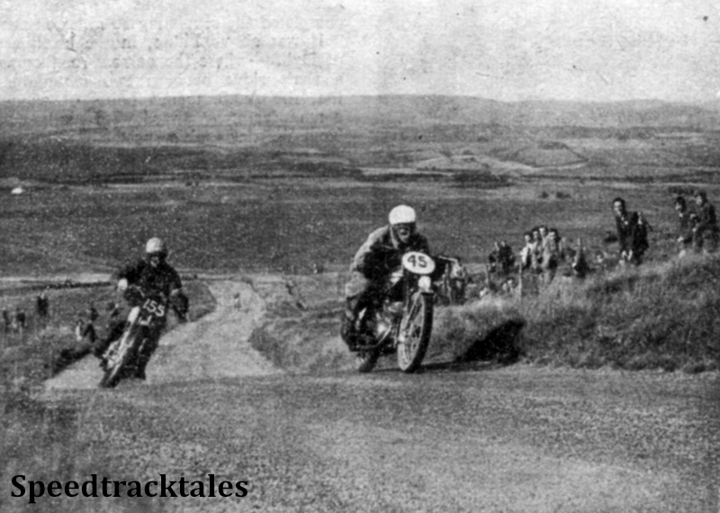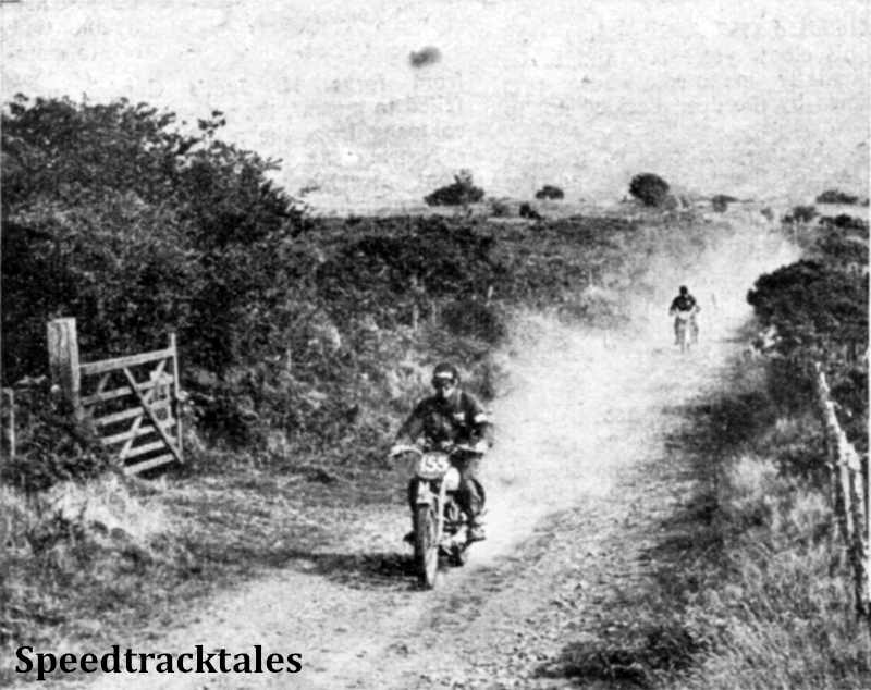 Photo – On Saturday’s Eppynt speed test #45 E Marha ( 125cc CZ) of the Czech Vase team, with coming up fast astern #155 SB Manns (Triumph, one of Britian’s Vase men ISDT 1949 (Speedtracktales Collection)