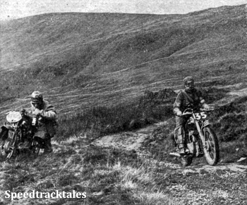 Photo – #146 Ted Usher (Matchless) climbs Bwlch y Groes followed by #88 A J Humphries (Norton sc) ISDT 1949 (Speedtracktales Collection)