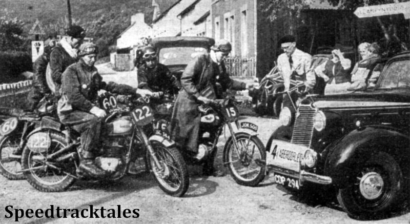 Photo – A scene at Abergorlech on Tuesday’s run. Interested local residents watch the ACU official check-in #13 Johnny Britain (James) while #122 AF Gaymer (Triumph) Britian’s Vase A Team member, #60 RS O’Neill (Velocette) and others queue up. ISDT 1949 (Speedtracktales Collection)