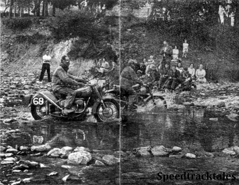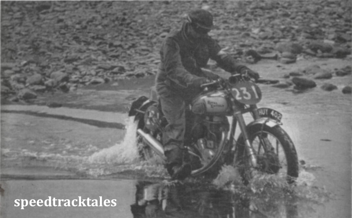 photo – 1949 Wales: # 231 Charlie Rogers (“350 Bullet”) negotiating the Abergwesyn water splash in the heart of the Welsh mountains. The approach to the stream is typical of the rough going encountered through the trial. ISDT 1949 (Speedtracktales collection)