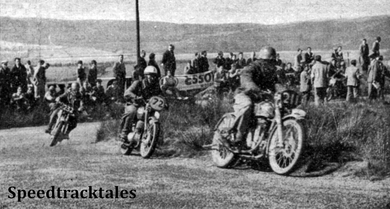 Photo – Eppynt Speed Test Circuit #211 EH Stephens (347 Matchless) leads #72 A Dufek (259 Jawa) and #232 F Ridyard (348 BSA) round Dixie’s Corner ISDT 1949 (Speedtracktales Collection)