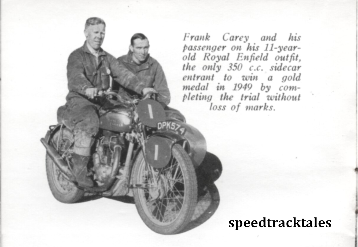 photo – #1 Frank Carey and his passenger on his 11 year old Royal Enfield outfit [DPK 574]. The only 350cc sidecar entrant to win a gold medal in 1949 by completing the trial without loss of marks. ISDT 1949 (Speedtracktales collection)
