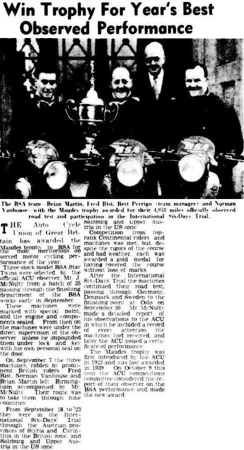 THE Auto Cycle Union of Great Britain has awarded the Maudes trophy to BSA for the most meritorious observed motor cycling performance of the year. Three stock model BSA Star Twins were selected by the official ACU observer, Mr. J. McNulty from a batch of 35 passing through the finishing department of the BSA works early in September. These machines were marked with special paint and the engine and components sealed. From then on the machines were under the direct supervision of the observer unless he impounded them under lock and key with his own personal seal on the door. On September 7 the three machines, ridden by prominent British riders Fred Rist, Norman Vanhouse and Brian Martin left Birmingham accompanied by Mr. McNulty. Their route was to take them through nine countries. From September 18 to 23 they were in the International Six-Days’ Trial through the Austrian provinces of Styria and Carinthia in the British zone, and Salzburg and Upper Austria in the US zone. Competition from top rank Continental riders and machines was met, but, despite the rigors of the course and bad weather, each was awarded a gold medal for having covered the course without loss of marks. After the International Six-Days’ Trial the machines continued their road test, passing through Germany, Denmark and Sweden to the finishing point at Oslo on September 30. Mr. McNulty made a detailed report of his observations to the ACU in which lie included a record of every attention the machines had received, and later the ACU issued a certificate of performance. The Maudes trophy was first introduced by the ACU in 1923 and was last awarded in 1939. On October 9 this year the ACU competitions committee considered the report of their observer on the BSA performance and made the new award.”