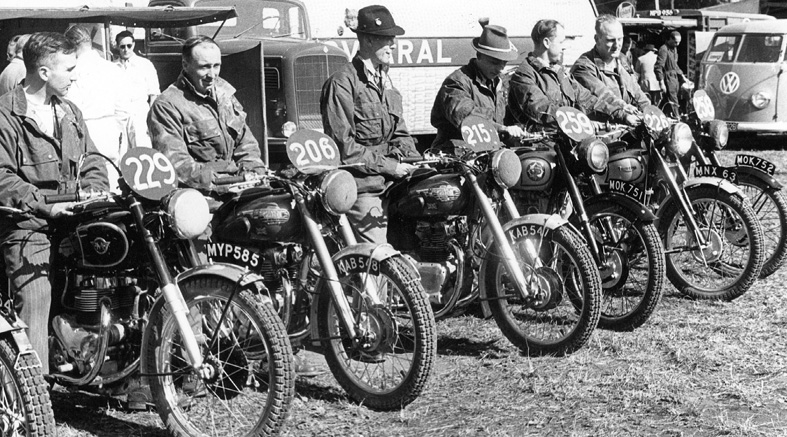 Photo – L to R – British rider line up #229 Dick Clayton (Matchless) [MYP 585], #206 Don Evans (500 Royal Enfield twin) [KAB 548], John Brittain (500 Royal Enfield twin) KAB 547], David Tye (BSA) [MOK 751], Peter Hammond (Triumph) [MNX 63] and Tom Ellis (BSA) [MOK 752]. ISDT 1952 (courtesy Deryck Wylde collection)