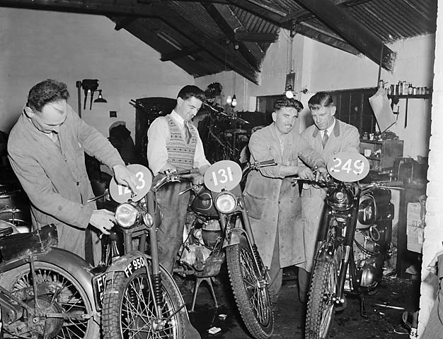 The Bala & District Motor Club entered a club team in the competition of #123 Evan Jones (Bala) [FF 950], #131 J. R. Lloyd (Llandderfel), mechanic J. Wood and #249 Jim D Davies (Oswestry) all seen here preparing motorcycles for ISDT 1945 (Photo by Geoff Charles Courtesy of the National Library of Wales)