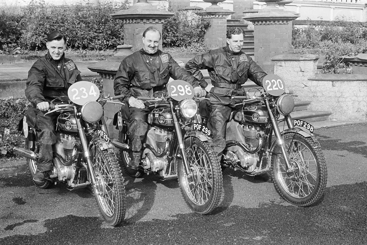Photo Ariel Works team #234 WSG Parsons 497cc Ariel #298 CM Ray 497cc Ariel [POF 299] #220 NS Holmes 497cc Ariel ISDT 1954