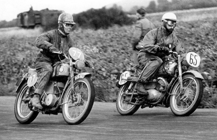 Photo – #77 PT Stirland on a factory 147 James with #65 G Leistner of Germany 171 Airdie in the final day Speed Test at Madley ISDT 1954 (Courtesy Deryck Wylde Collection)