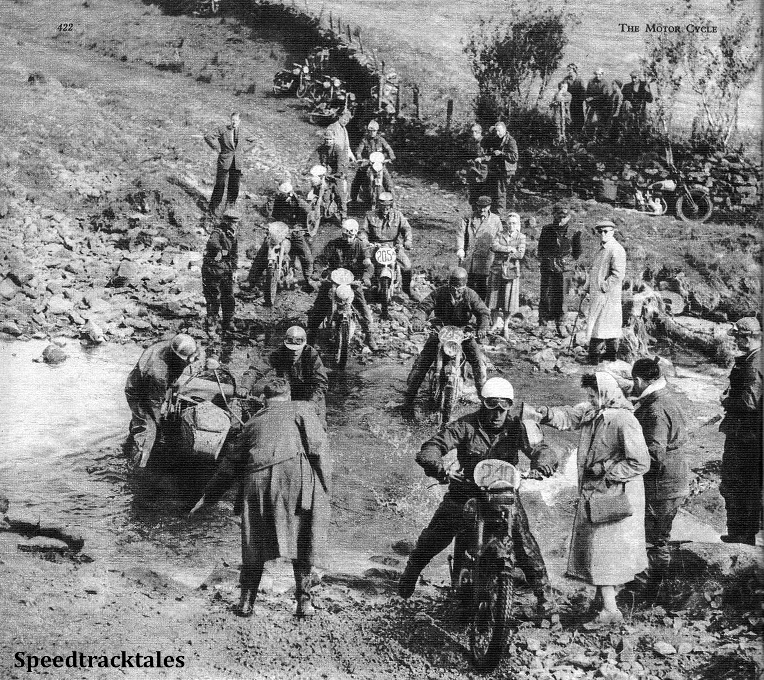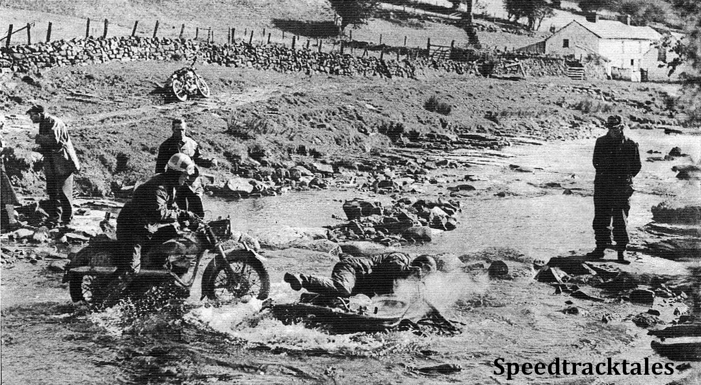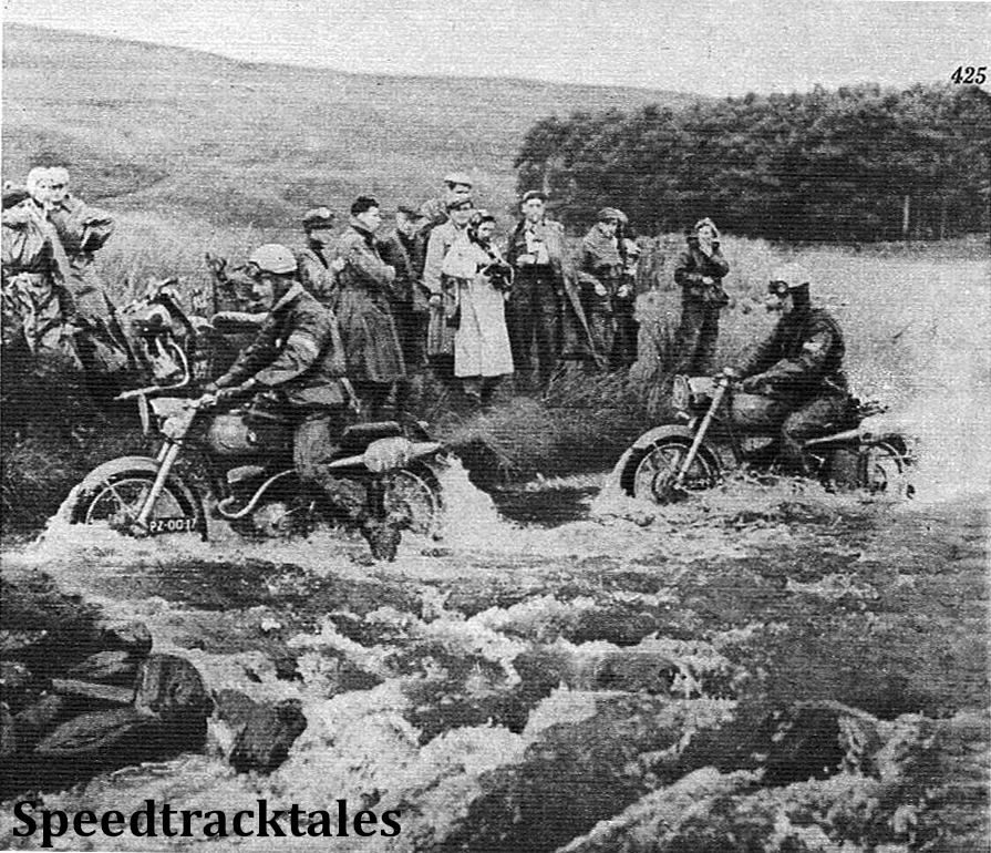 photo – Deep water was encountered on many parts of the Eppynt Artillery range. The leading rider is #174 O. Haas (247 NSU). Behind him is L Erlandsson (174 Husqvarna), of Sweden ISDT 1954 (Speedtracktales Archive)
