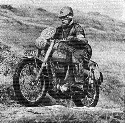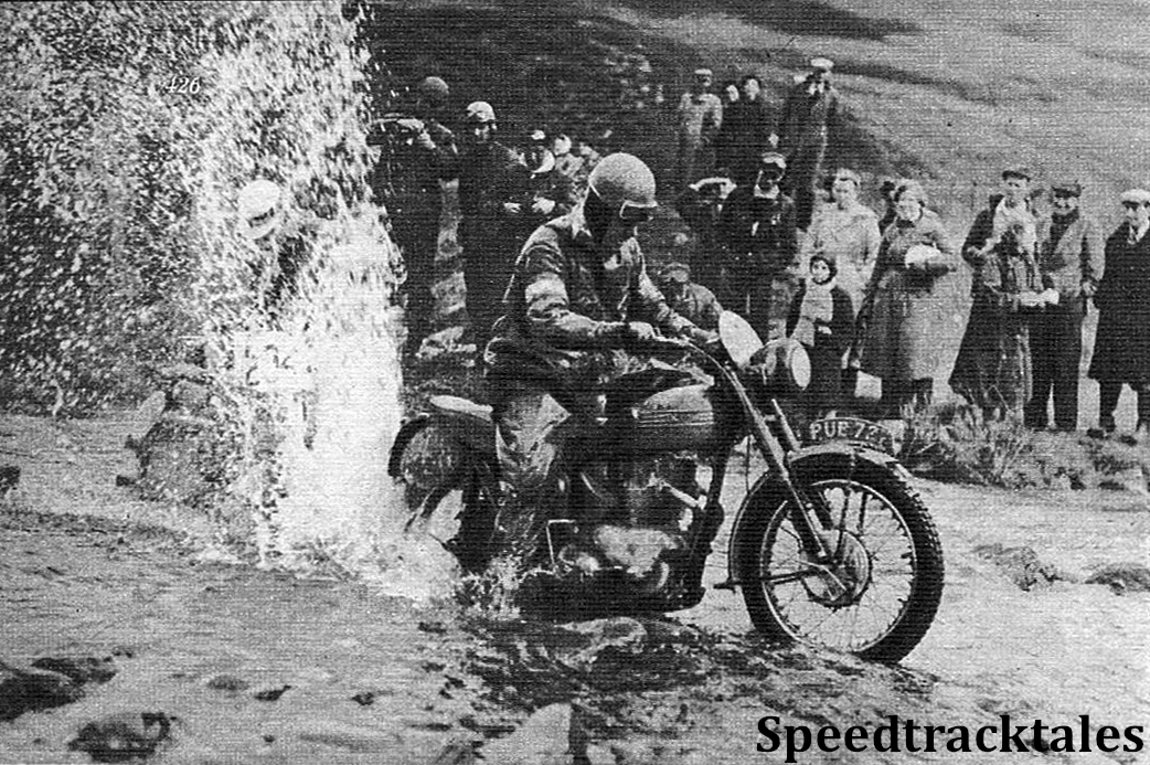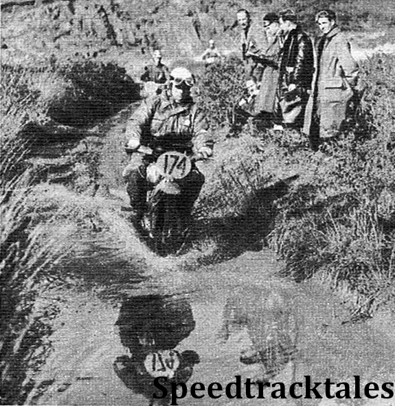 Photo – feet up balanced is the correct way to ride deep waterlogged ruts #222 Johnny Giles 498cc Triumph [PNK 660] ISDT 1954 (advrider forum)