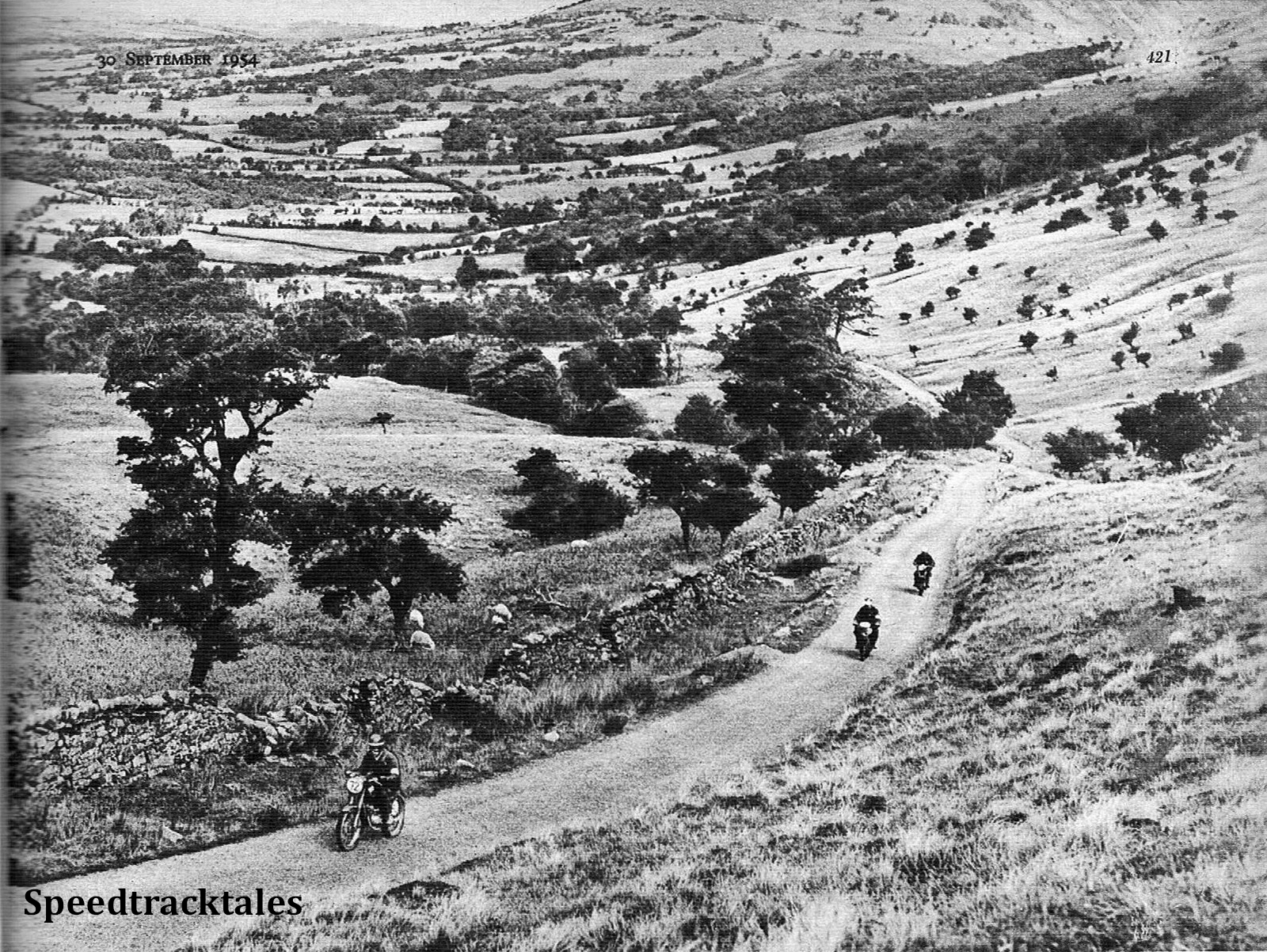 photo – Riders strive to make up time on a tarmac section of the route. Here, near Forest Lodge, above the Senni Valley, J.Pudil (148 Jawa) of the Czech Trophy team , is followed by M. Rive (124 Rumi), of the Italian Vase ‘A’ team, and G. Bodmer (174 DKW), of the German Vase ‘B’ team ISDT 1954 (Speedtracktales Archive)