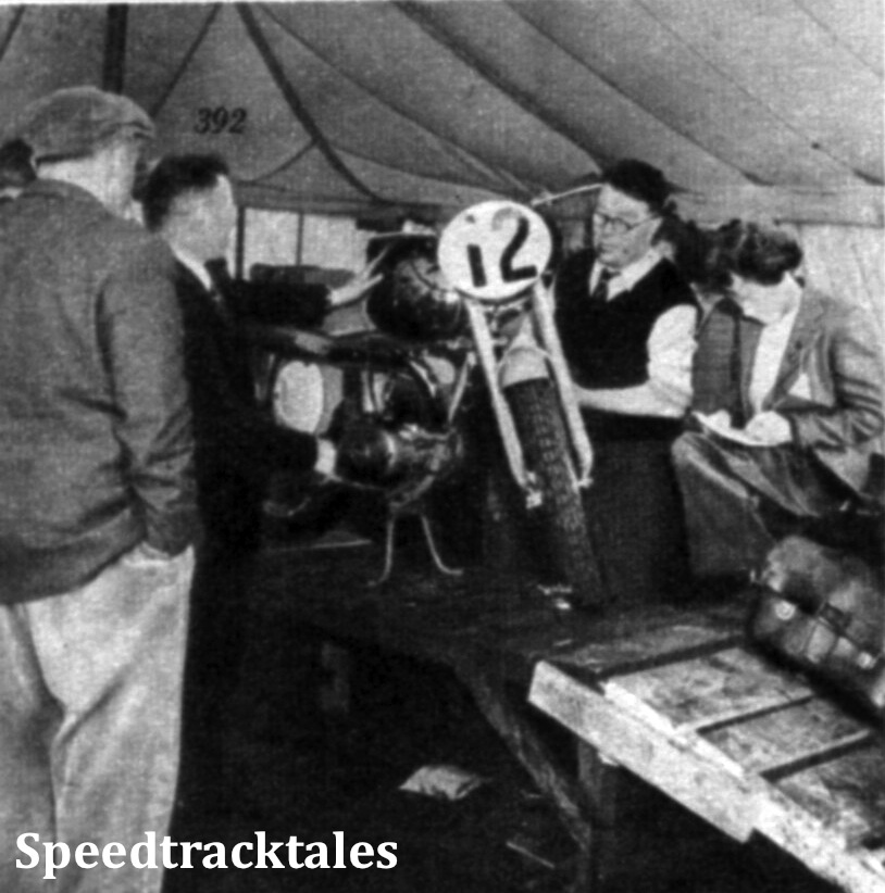 Photo – J. McNulty, in shirtsleeves, scrutineers #12 U. Pohl’s German Maico ISDT 1954 (Speedtracktales Collection)