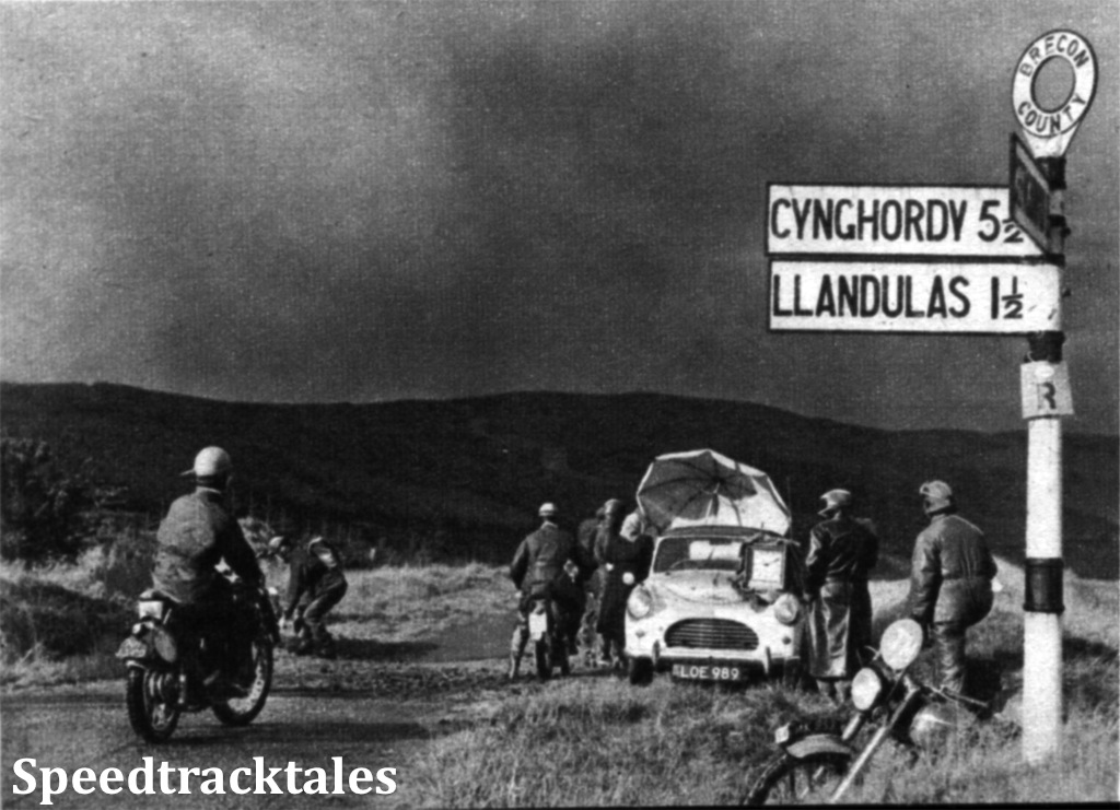 Photo of a Gypsy lad in clogs leads a convoy of family wagons past the Llandovery Check point oblivious to the ISDT in progress.