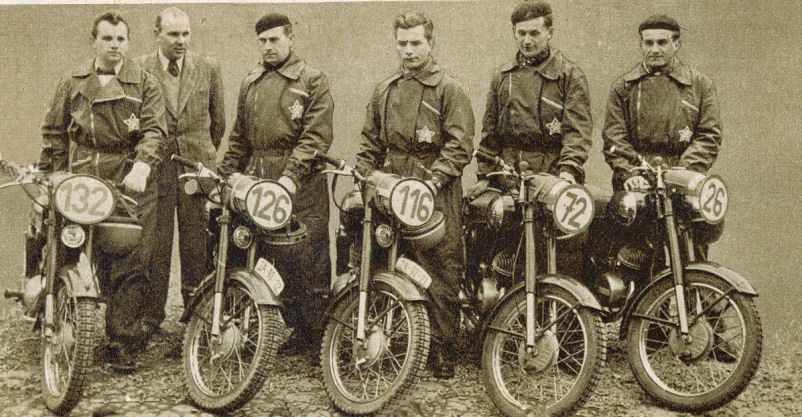Photo of the all conquering Czech Trophy team, all on JAWA!, from left #132 V Sedina, #126 J Kubes, #116 S Klinu, #72 J Pudil, #26 B Roucka at ISDT 1954