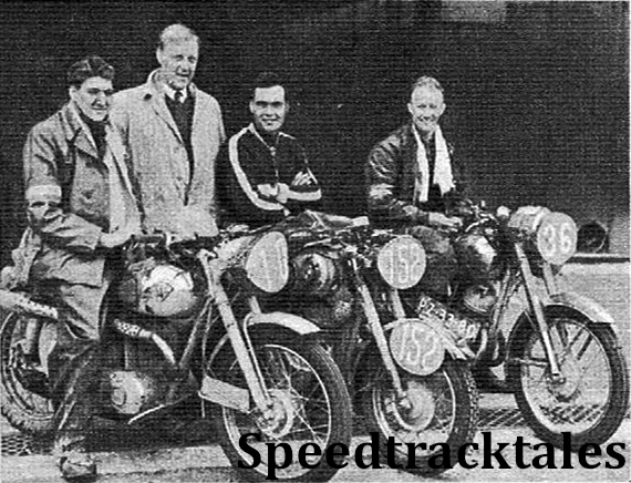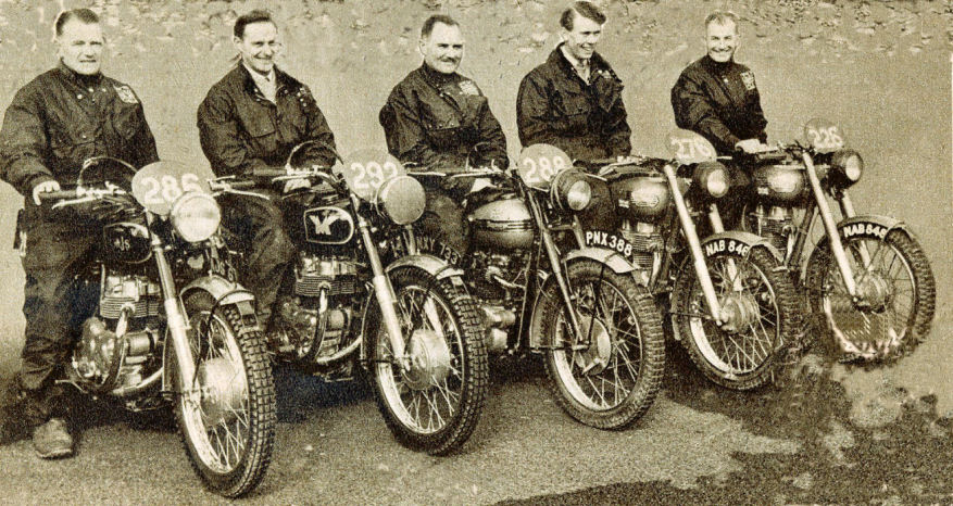 Photo of Britain’s “No Penalty” Team, the very first to complete the course unpenalized, from the left #285 B H M Viney 500cc AJS, #293 S B Manns 500cc Matchless, #288 P H Alves 650cc Triumph, #276 J V Brittain 350cc Royal Enfield & #226 J W Stocker 350cc Royal Enfield in ISDT 1954