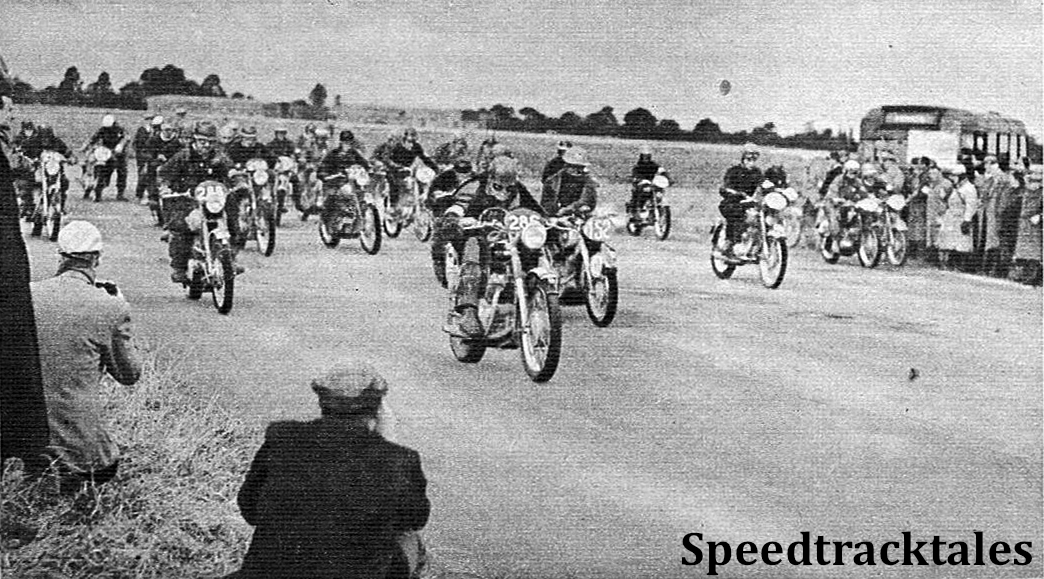 photo – Start of the one hour speed test at Madley airfield. Riders in the foreground are #286 BHM Viney (498 AJS), #152 M den Haan (248 Puch), Netherlands and #288 PH Alves ISDT 1954 (Speedtracktales Archive)