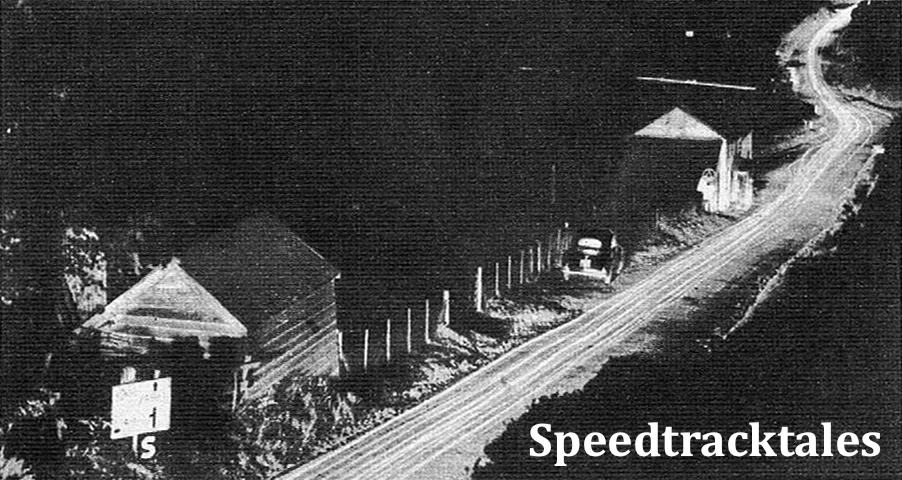 photo – The road is streaked with Orange threads of lights during Tuesday’s run. Riders are travelling North on A483, which leads towards Newtown. ISDT 1954 (Speedtracktales Archive)