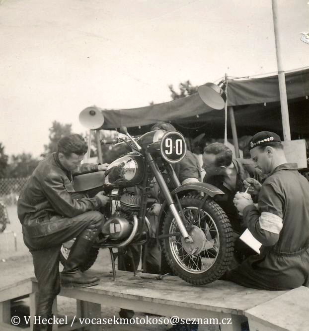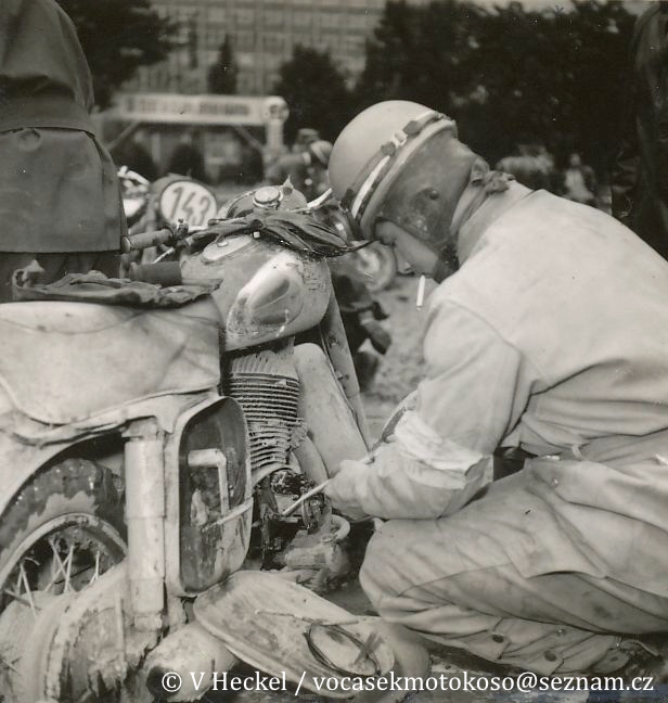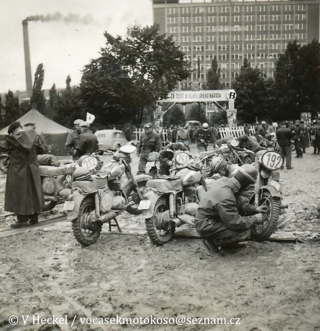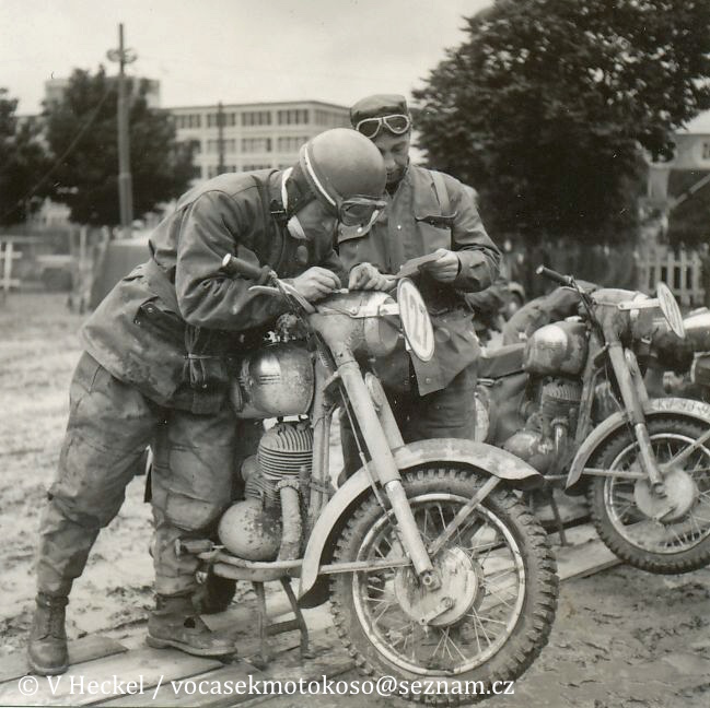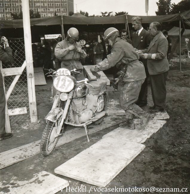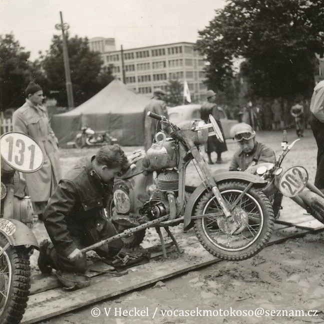 photo – #212 Josef Brabec Jawa 250 Czechoslovakia Gold medal #142 Per Oppegard 248 NV Holland Rtd Day 2 #192 Jaromir Holy 250 Jawa Czechoslovakia Silver Medal #127 Jaromir Cizek 248 Jawa Czechoslovakia in work area ISDT 1955 (©V Heckel)