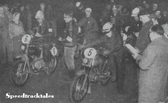 Photo – At 6:35am #5 G Sengfelder of West Germany gets the signal to start his 49cc Zundapp while Swiss Vase teamster #6 H Haller waits with his 49cc Kreidler. ISDT 1961 (speedtracktales collection)
