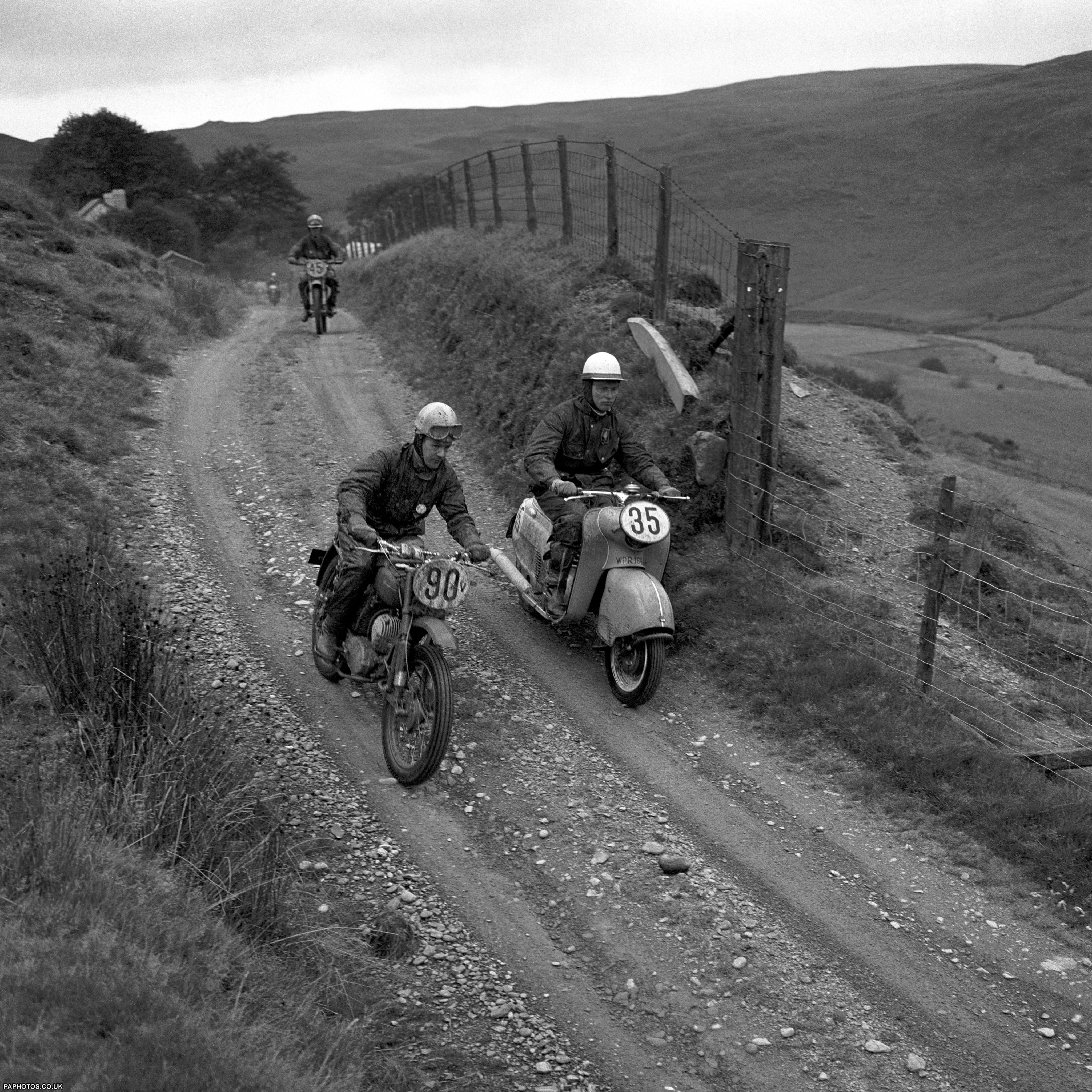 Photo – #31 Alan Kimber (175 Lambretta) leads Italian #67 G. Siani (175 Moto-Guzzi). ISDT 1961 (speedtracktales collection)