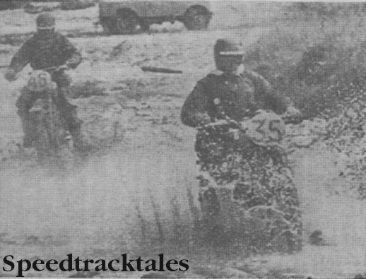Photo – Trying to be as fast as a speed boat is #35 Fred Billet. Behind him is Finnish rider #46 Pertti Karha ISDT 1962 (Speedtracktales Collection)