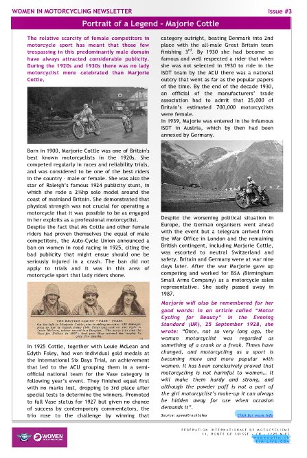 It came as a great pleasure when browsing recent FIM publications to see their ‘Women in Motorcycling Newsletter‘ which in issue 3 of 2013 featured a fantastic article on Marjorie, who remains a modern inspiration and, just like the often overlooked 20’s English travel writer Freyer Stark, her life is long overdue a Hollywood / Elstree Biopic feature film. I am please also to note that the FIM credits Speedtracktales as the source of their article. Its great to be paying back our gratitude to the FIM for the help they have given scanning their archive of ISDT results for our use.